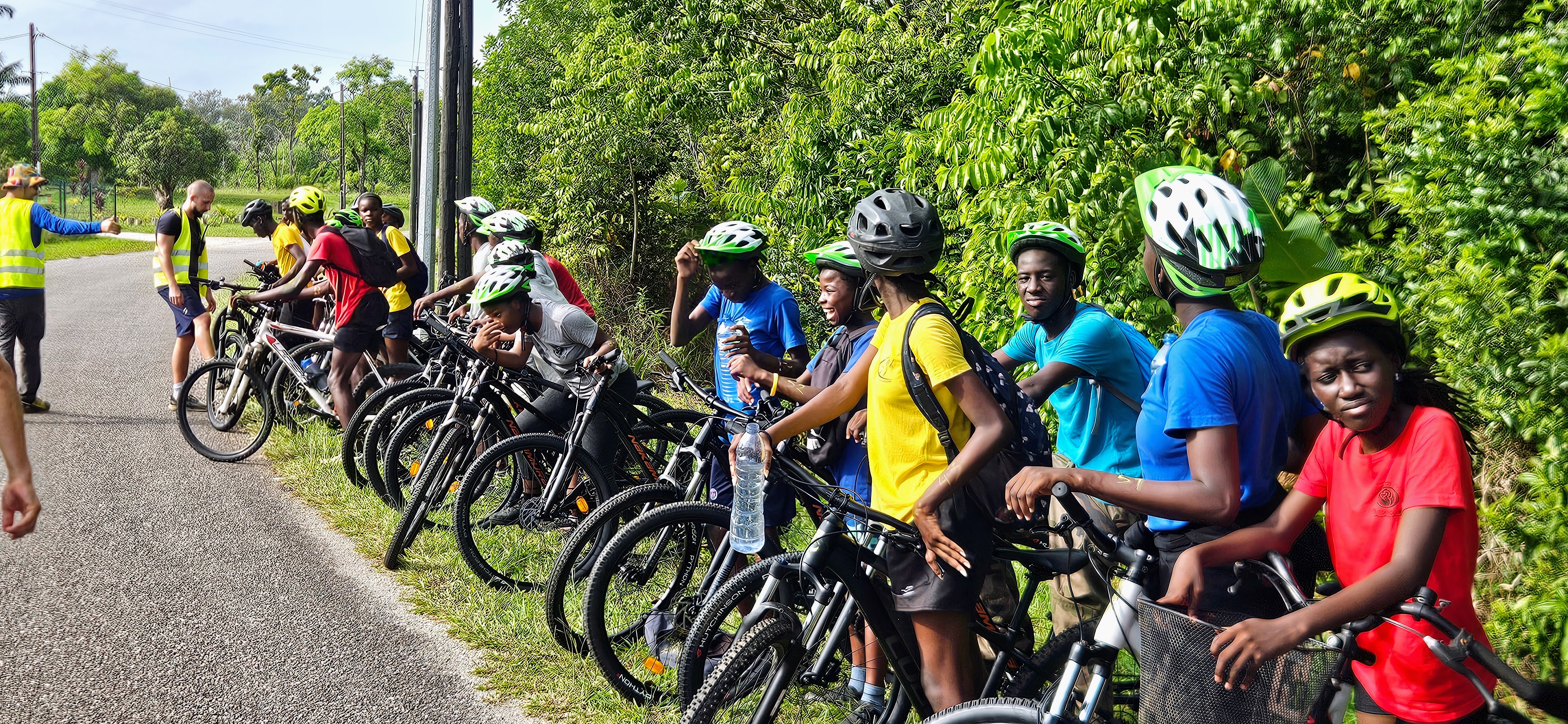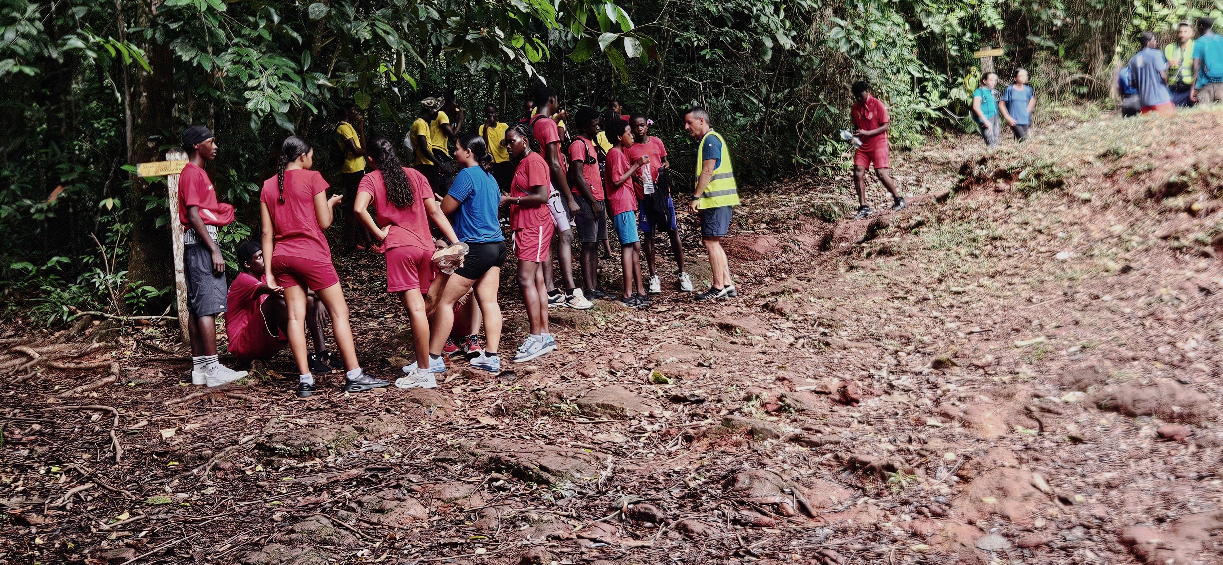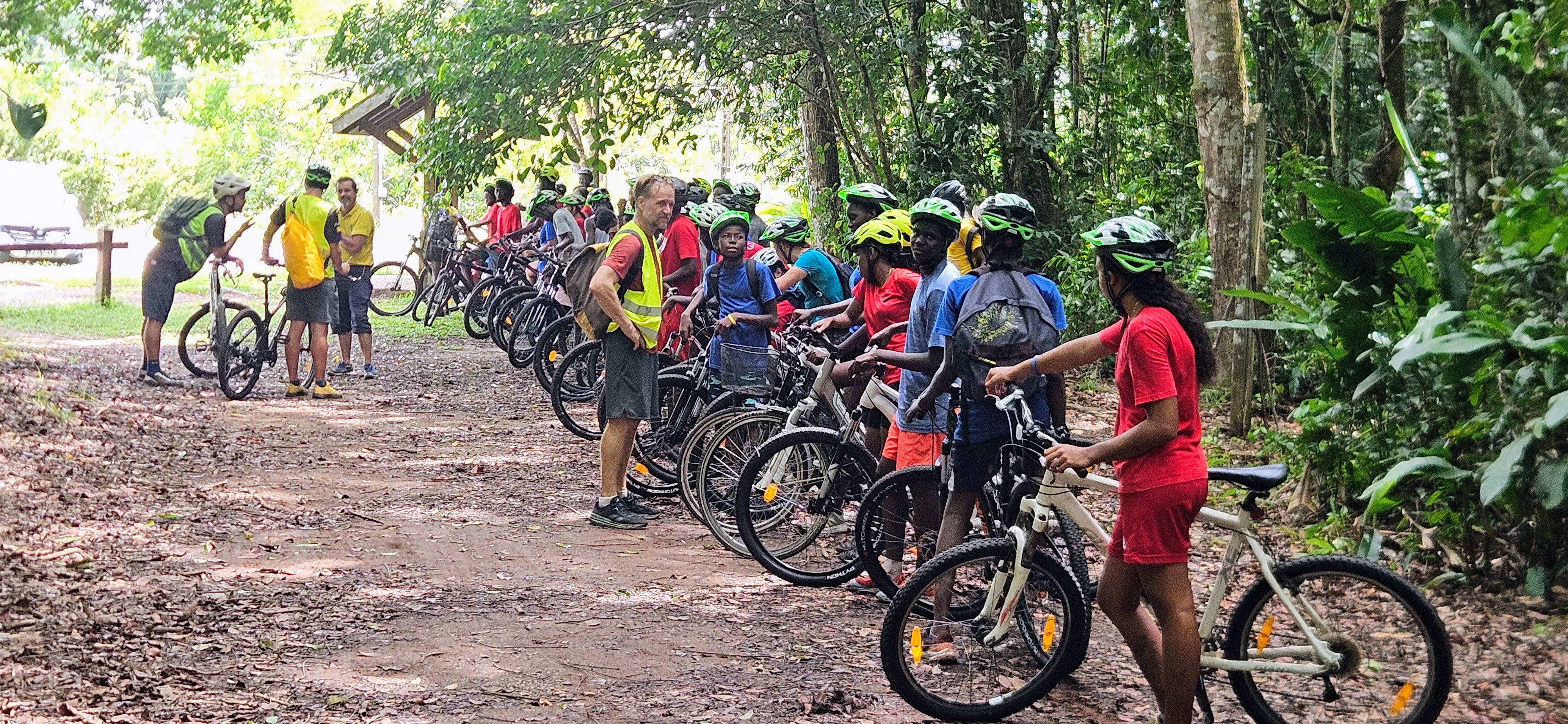 Les équipes ont ensuite quitté le collège Victor Schoelcher pour gagner en VTT le parking de la Montagne des Singes. Le trajet, long mais plat, a permis d’installer un rythme collectif et de mobiliser les premiers efforts de la journée.
